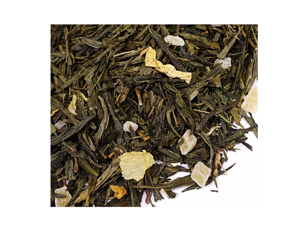 Zloženie: Zelený čaj typu sencha, kandizované mango 10% (v cukre), lupienky slnečnice, vôňa.
